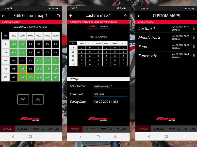 WiGet!XXF 450 è dotata di app dedicata “WiGET”, disponibile per Android e iOS, che utilizzando il proprio smartphone permette di intervenire sui parametri della centralina andando a gestire la mappa di anticipo e la mappa di carburazione. La soluzione perfetta per avere sempre a disposizione il setup ideale a ogni tipo di terreno e a ogni tipo di condizione ambientale. Potrai scoprire i setting sviluppati da Fantic Racing o creare la mappatura ideale al tuo stile di guida e alle tue esigenze. E’ inoltre possibile leggere il contaore della moto, aggiungere note di servizio, leggere la diagnostica e visualizzare i dati del motore in tempo reale.
